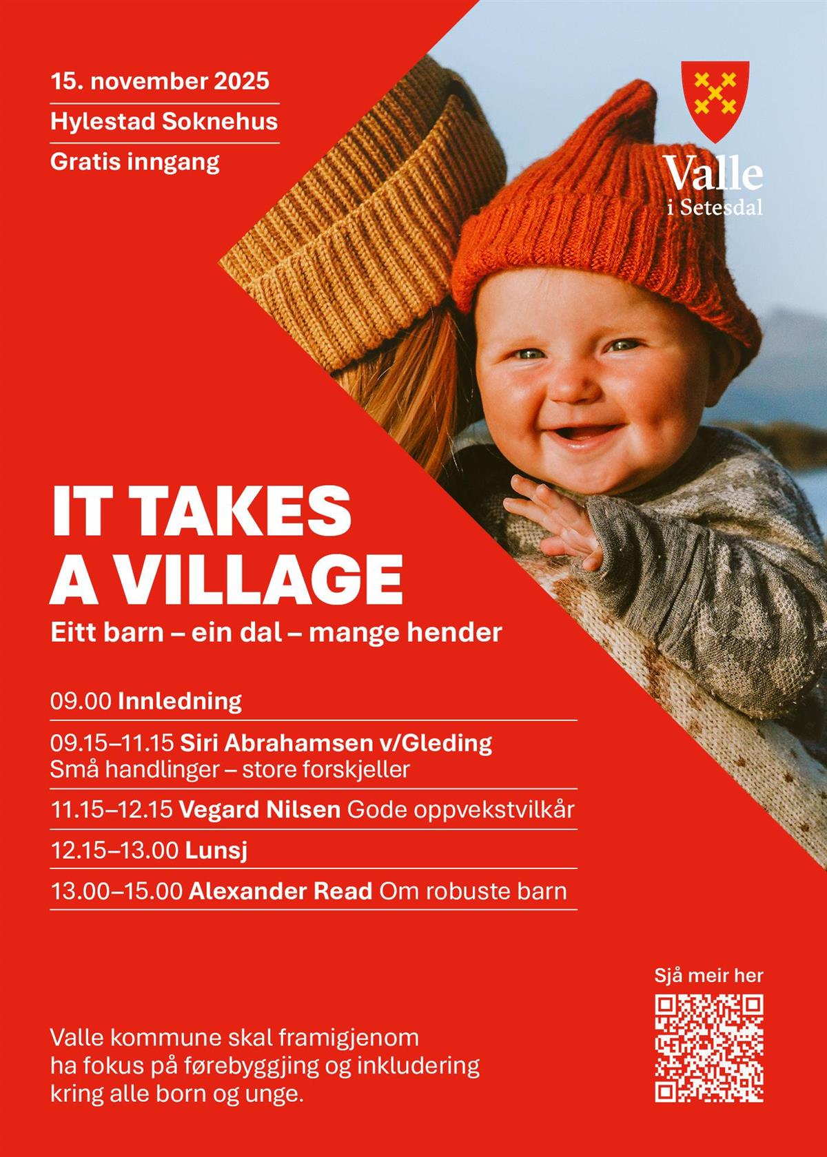 Velkomen til It Takes a Village - ein festivaldag i Valle som samlar alle som bryr seg om barns oppvekst; foreldre, besteforeldre, frivillige og fagfolk frå ulike felt. Målet er enkelt: å dele kunnskap, skape refleksjon og styrke det lokale fellesskapet som gir barn gode vilkår.